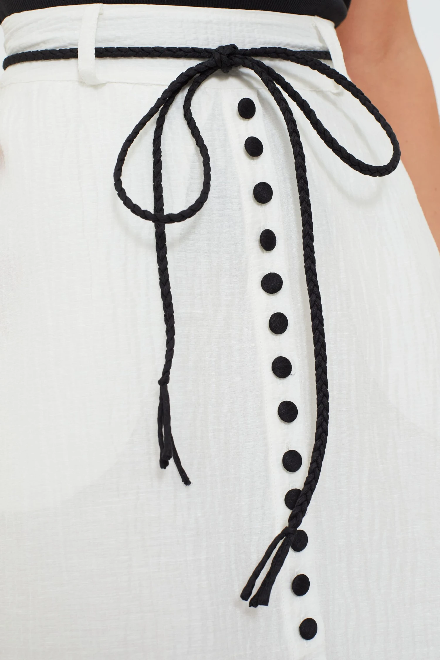 You will be poised and elegant in the Alba Black Grace Silk Linen Skirt. This midi is a full circle skirt, made from an airy silk linen blend with embroidered detailing along the scalloped hem. The self-tie waist allows for a perfect fit, and the front button placket is classic and cute. Pair with a simple black turtleneck, or with the Alba Black Gabriella Silk Linen Shirt for an unforgettable matching set.