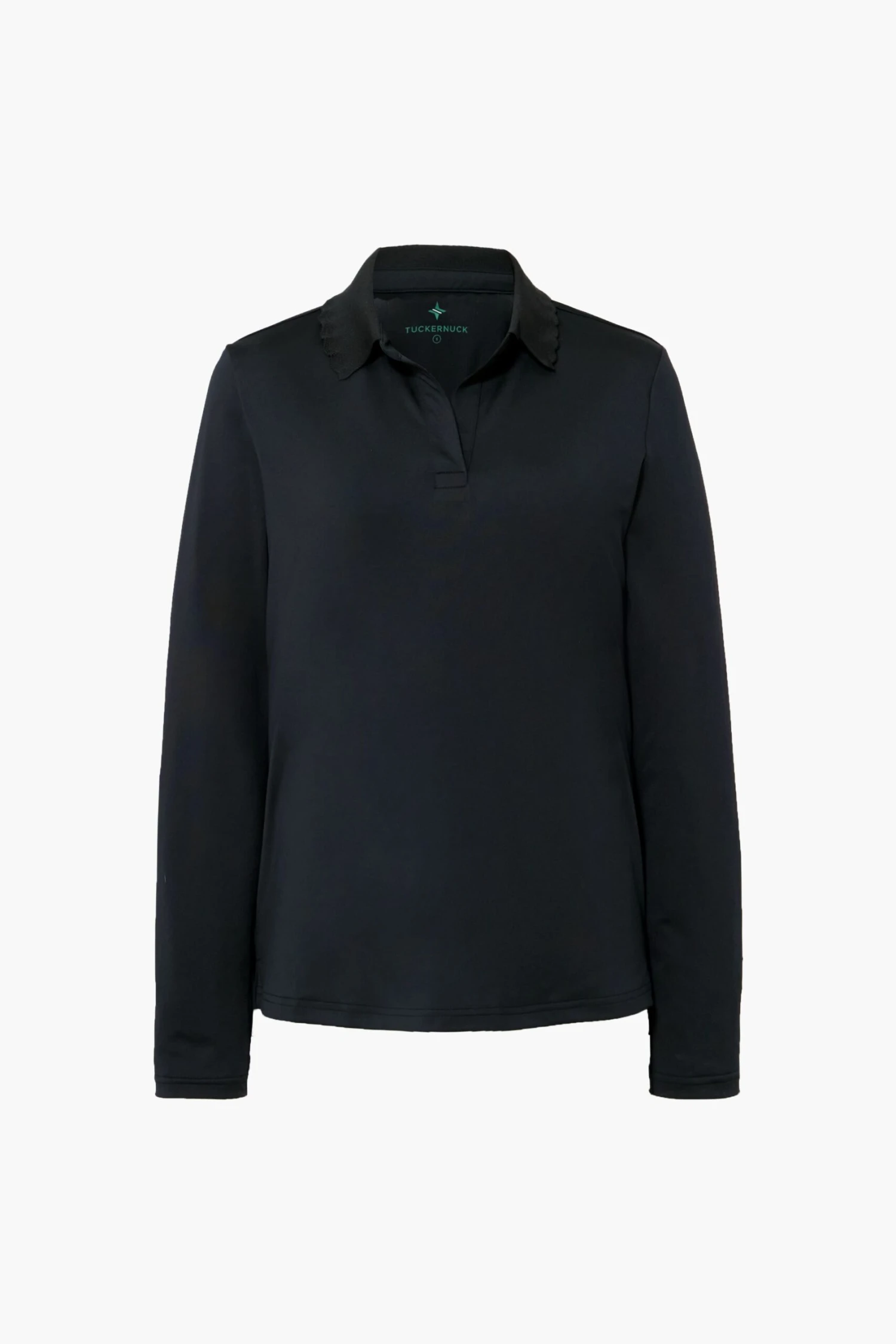 The Black Long Sleeve Caroline Polo is a classic look with modern tailoring. Feminine scallops adorn the edge of the collar in a classic black, creating a chic moment to finish out this all activities top. Featuring an V-neckline, boxy fit, and an ideal length for tucking with ease, this piece keeps it cool even when the match gets hot. We designed this with tennis and golf in mind, but it works well for a power walk or pickleball match too!