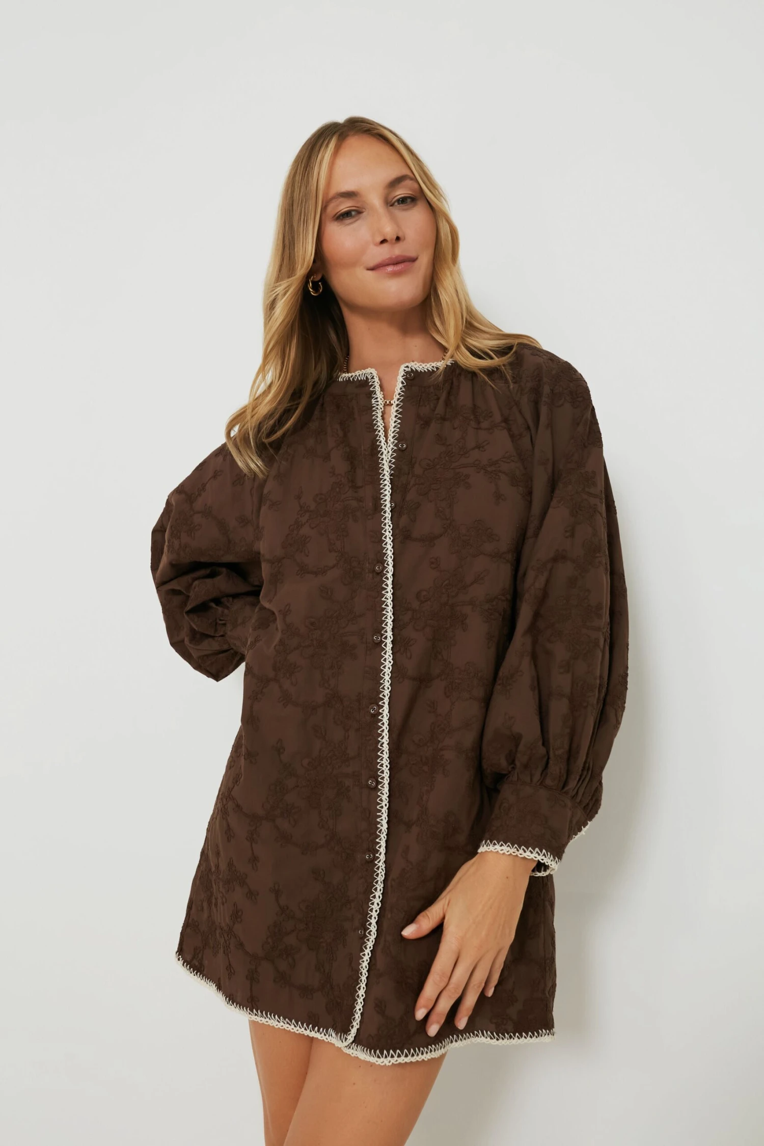 Meet the Brown Textured Shirt Dress – the perfect style to take you from coffee runs to happy hours with ease! The rich brown hue is accented by a cream whipstitch hem, all elevated by the unique textured fabric. Pair with neutral flats and crossbody for a laidback yet chic look for busy days, and change into platforms and gold jewelry for your next dinner date!