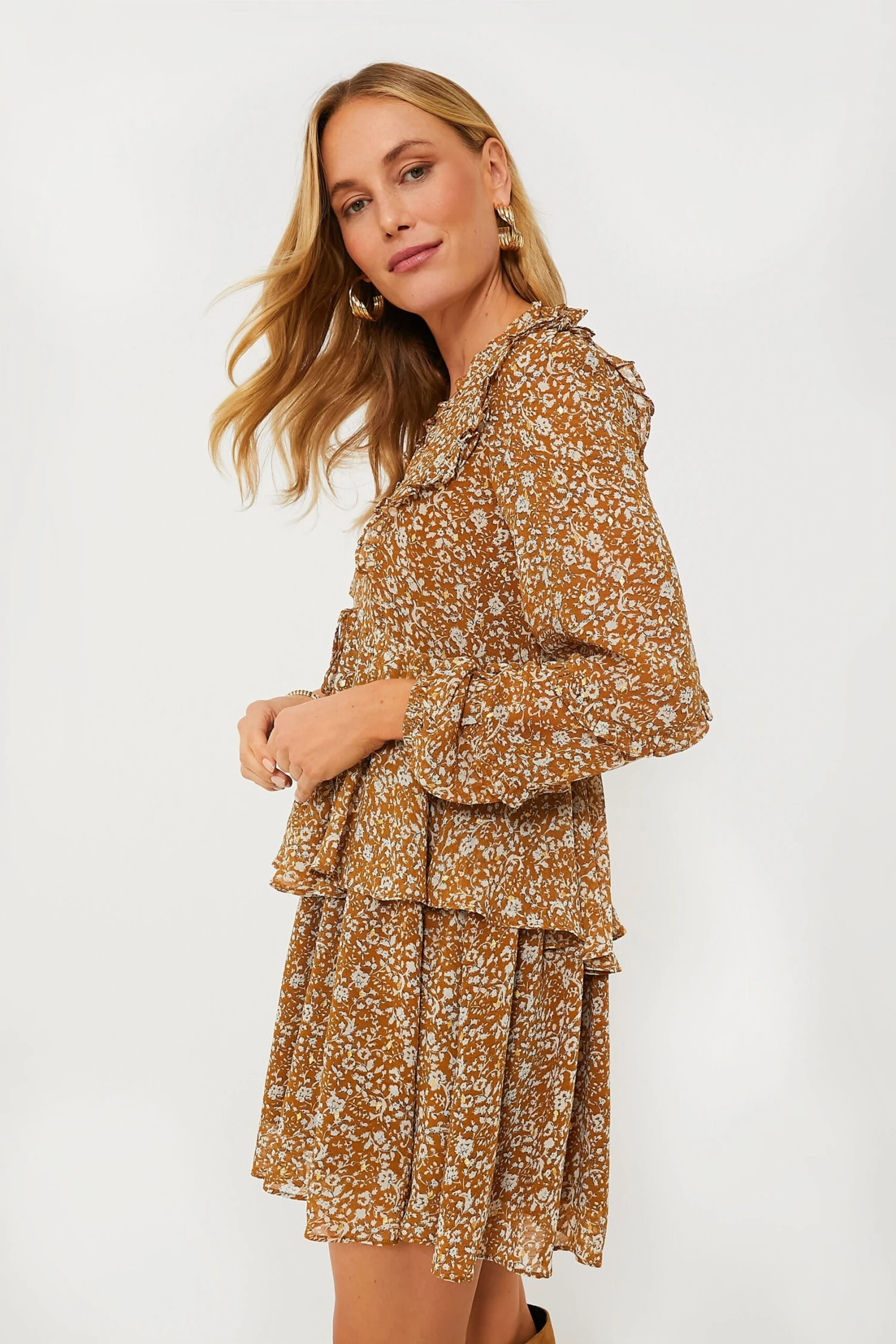The Chestnut Floral Long Sleeve Liza Dress is an adorable midi that is perfect for date nights, weekends, and everything in between. This flouncy silhouette has a mid-weight, chiffon feel with sheer sleeves and gold accents. The elastic cuffs, tiered skirt, and cinched waist make this a flattering shape that can be fit to your body. Pair with gold jewelry and knee boots for a classy all-occasion look.
