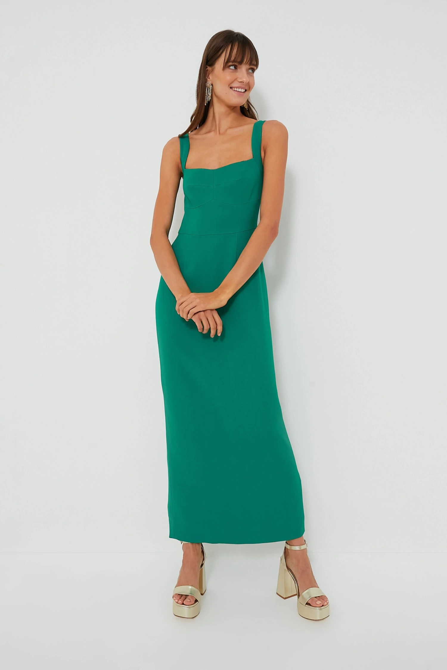 An elegant style, the Rachel C Dress is a flattering midi that comes in an enchanting emerald green color. The square neckline, wide shoulder straps, and fitted shape create a silhouette that is nothing short of classy. Pair with gold heels, drop earrings, and a clutch for an outfit that will grace any event.